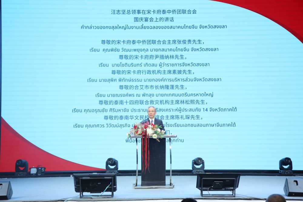 在宋卡府,汪志坚分别出席宋卡府泰中侨团联合会和宋卡五属会馆举办的国庆侨宴并发表致辞。他向侨胞致以节日祝福,回顾新中国历史性发展成就和对世界和平发展事业的突出贡献,勉励侨胞积极投身中泰命运共同体建设。