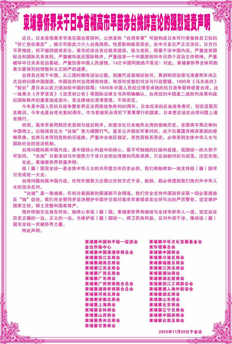 AseanAll /东盟全景讯 据柬埔寨华文媒体消息,2025年11月20日,柬埔寨最具代表性的33个华人华侨社团发表联合声明,强烈谴责日本首相高市早苗涉台挑衅言论。