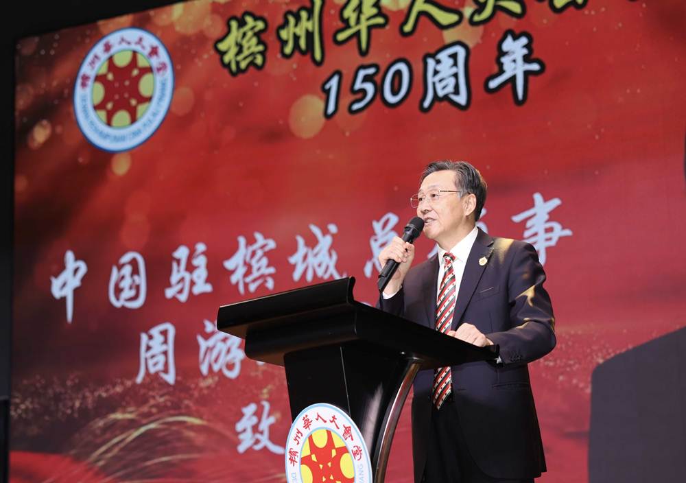 据中国驻槟城总领事馆消息,12月7日,中国驻槟城总领事周游斌出席槟州华人大会堂150周年联欢庆典,槟州首席部长曹观友、槟州立法议会议长刘子健、马来西亚人力资源部长沈志强、马来西亚财政部副部长林慧英、槟州华人大会堂主席陈坤海等800余名各界嘉宾出席。