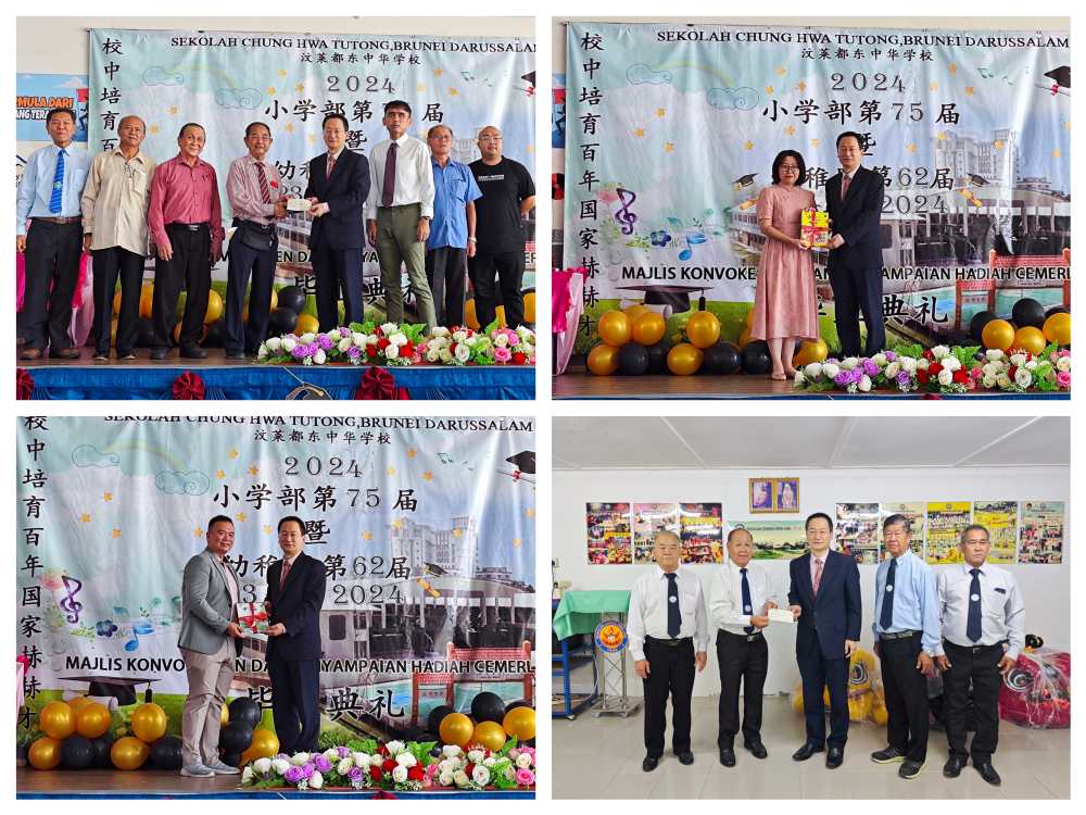 AseanAll /东盟全景讯 中国驻文莱大使馆消息,2024年11月23日,中国驻文莱大使馆临时代办王海涛应邀出席都东中华学校2024年毕业典礼,并走访那威中华学校,向两校捐赠助学款,并与学校董事长、校长及师生代表进行友好交流。
