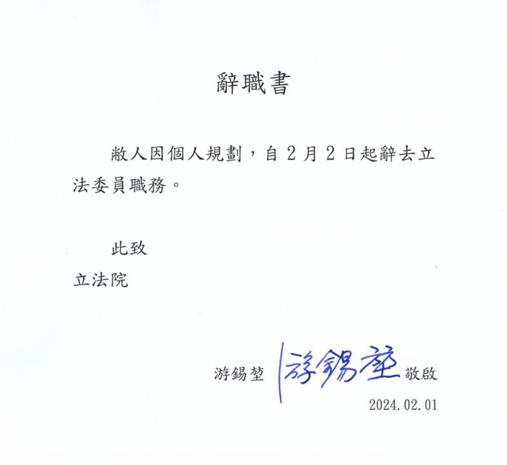 民进党的游锡堃选举落败后随即请辞。他在脸书表示,因个人规划,自2月2日起辞去“立法委员”职务。