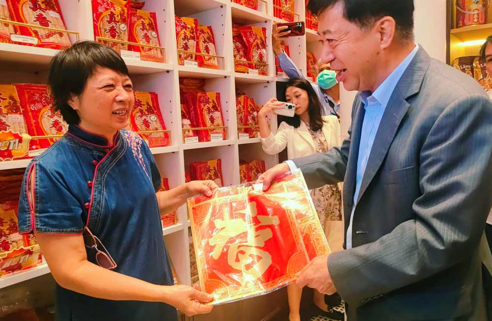 韩志强走进振和兴大金行、华人百年老店“林真香”,了解其经营、发展情况,对华侨华人艰苦创业、落地生根,为当地经济发展、商业繁荣所做的贡献给予充分肯定。韩志强与沿途店铺经营者亲切互动交流,并向他们致以新年祝福,赠送龙年挂历、春联、“福”字等新春礼物,受到热烈欢迎。