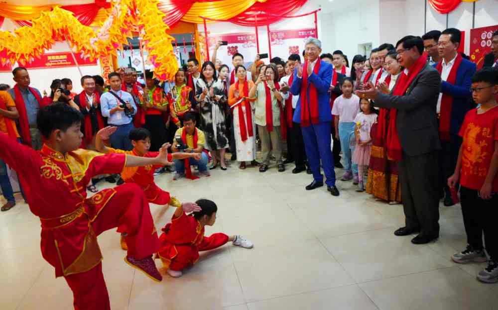来宾们共同为新春集市开锣,在展览体验区参与丰富精彩的新春活动。中缅两国书法家献上春联书法作品。来自云南的非遗传承人展示扎染、剪纸、剪影等传统技艺。中国茶艺展示、武术表演吸引来宾驻足,引得阵阵掌声。大家兴致盎然,近距离感受和体验中华文化,现场洋溢着友好、热烈的节日喜庆氛围。