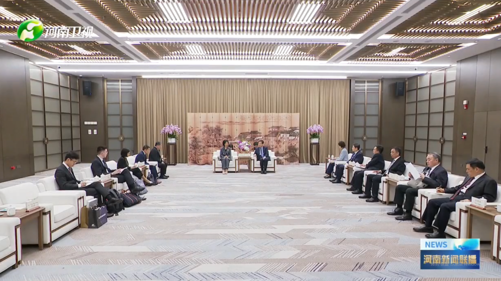 河南省省长王凯会见新加坡外交部兼国家发展部高级政务部长沈颖。图片来源:河南卫视电视截图