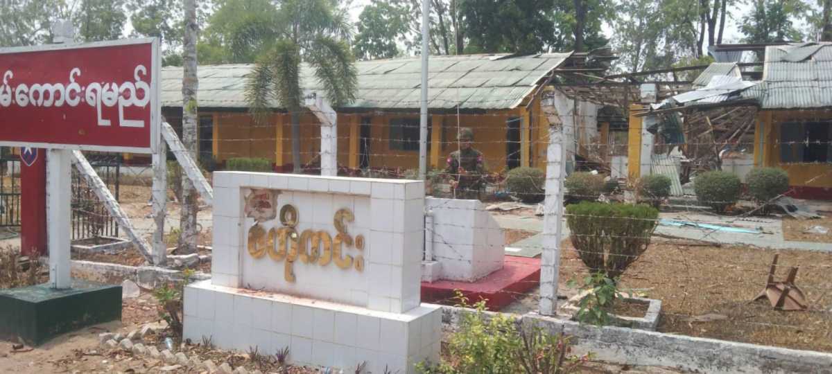 缅甸军队发起反攻重夺妙瓦底。缅军士兵4月23日重新控制当地一个军事基地后,将缅甸国旗升起。(取自网络媒体伊洛瓦底/ Irrawaddy )