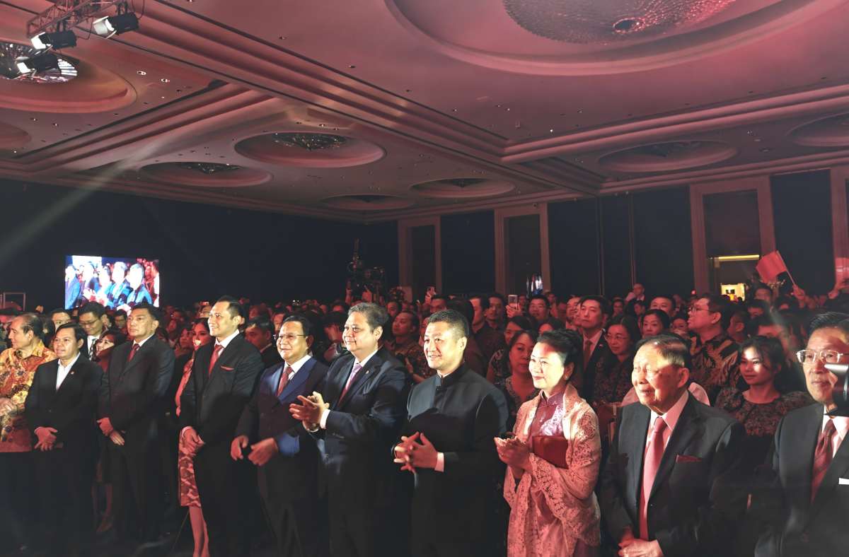 中国驻印尼大使陆慷主持招待会,印尼政府代表经济统筹部长艾尔朗加、海洋与投资统筹部长卢胡特、印尼人民协商会议副主席巴萨拉、印尼地方代表理事会副主席纳加穆丁、总统咨询委员会成员阿贡、国防部长普拉博沃、交通部长布迪,空军条令、训练与教育司令部司令特迪空军中将、海军气象水文中心主任努哈亚特海军中将、前海军参谋长马塞提奥退役上将、防长特别顾问沙夫里退役中将、前海岸警卫队司令玛玛西德海军退役中将、民主党总主席阿古斯等政要,印尼政府、议会、政党、智库、宗教,外国驻印尼使节等各界友人以及中资企业、华侨华人、汉语教师代表等1200余人出席。