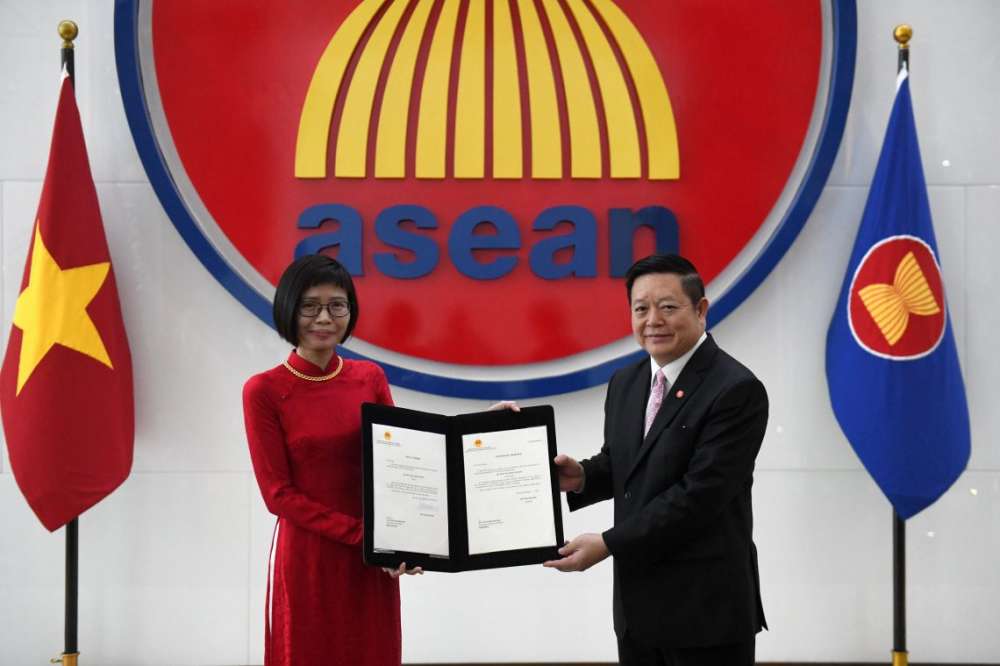 越南常驻东盟代表团团长孙氏玉香大使与东盟秘书长高金洪在国书递交仪式。图片来源:东盟秘书处