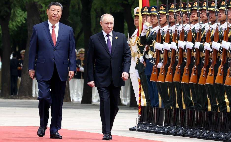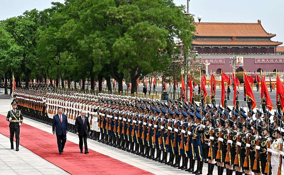 普京抵达时,礼兵列队致敬。两国元首登上检阅台,军乐团奏中俄两国国歌,天安门广场鸣放21响礼炮。普京在习近平陪同下检阅中国人民解放军仪仗队,并观看分列式表演。中俄两国少年儿童手持花束和中俄两国国旗向两国元首欢呼致意。