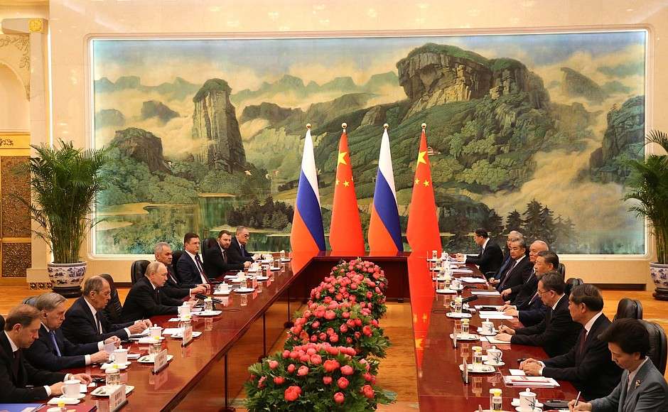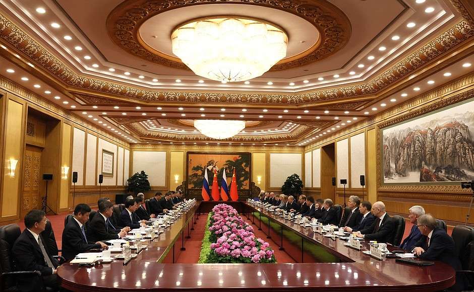 普京表示,他很高兴在就任新一届俄罗斯总统后再次访华。去年3月习近平主席也在连任后不久即对俄进行国事访问。这是我们两国的友好传统,表明双方对加强新时代俄中全面战略协作伙伴关系的高度重视。今年是中华人民共和国成立75周年,也是俄中建交75周年,值得我们共同庆祝。发展俄中关系不是权宜之计,不针对第三方,有利于国际战略稳定。俄方愿同中方持续扩大双边合作,密切在联合国、金砖国家、上海合作组织等框架内沟通协作,推动建立更加公正合理的国际秩序。