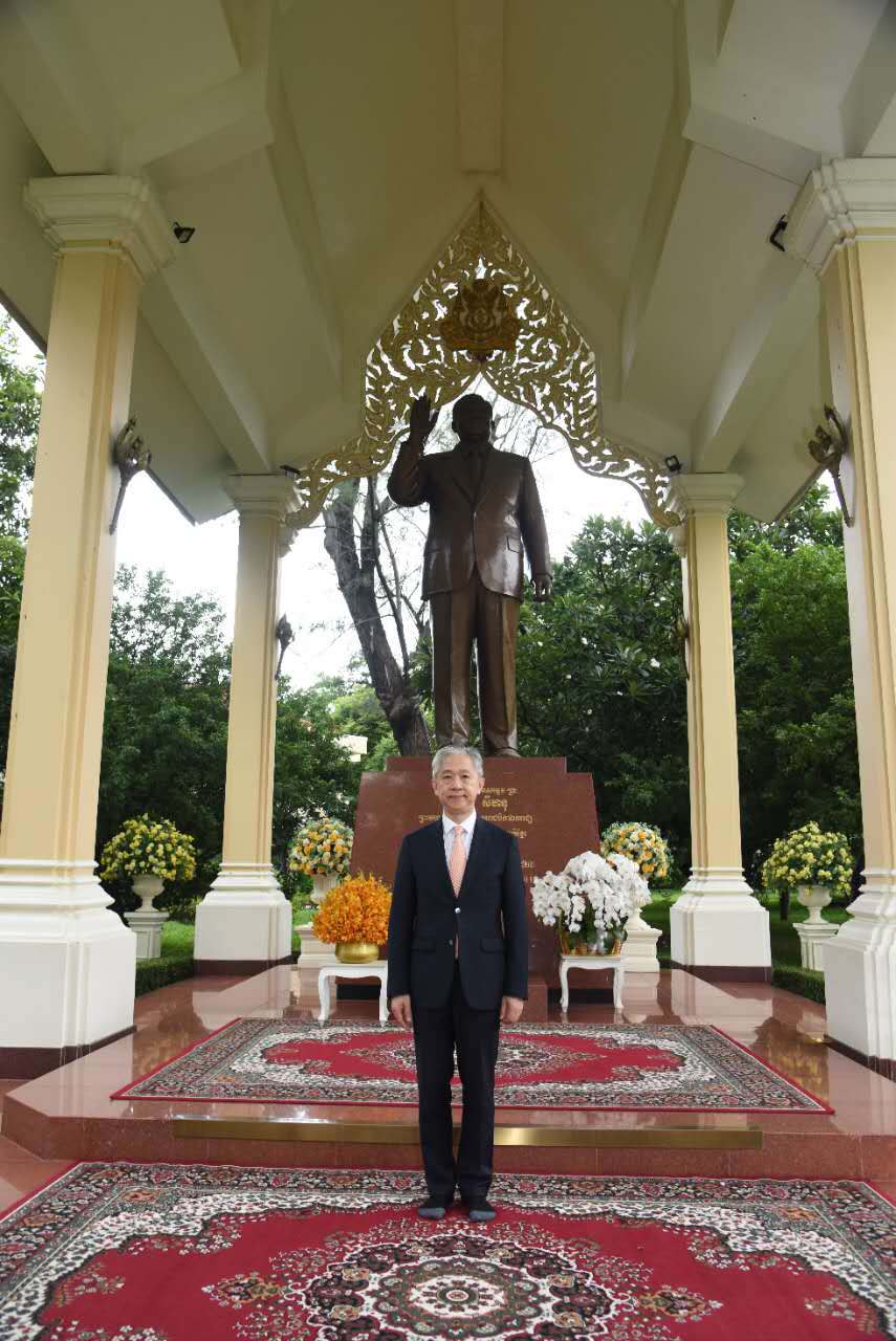 会见前,汪文斌向王宫内西哈努克太皇纪念雕像敬献花篮。