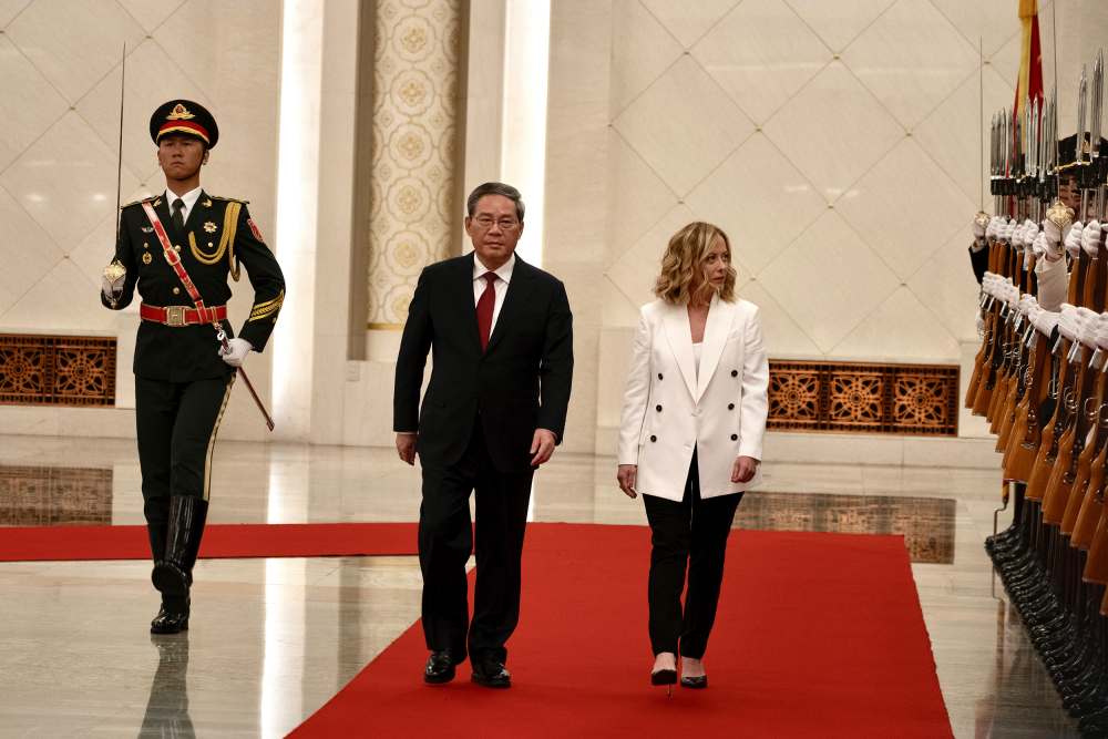 会谈前,李强在人民大会堂北大厅为梅洛尼举行欢迎仪式。