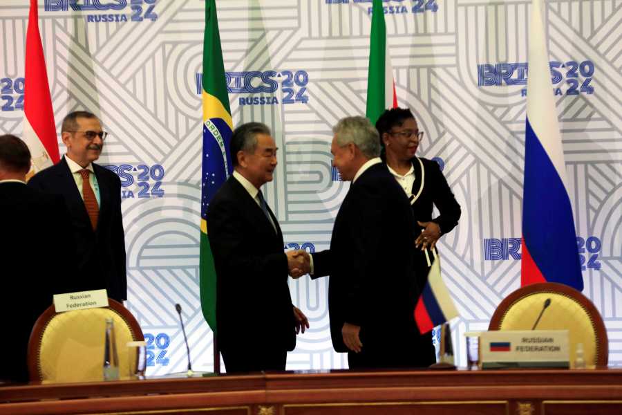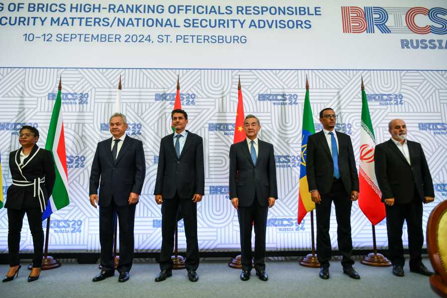 俄罗斯联邦安全会议秘书绍伊古主持会议,中共中央政治局委员、中央外办主任王毅、巴西总统首席特别顾问阿莫林、印度国家安全顾问多瓦尔、南非总统府部长恩特沙韦尼、埃及国家安全委员会秘书长埃尔丁、阿联酋国家最高安全委员会秘书长沙姆西、伊朗最高国家安全委员会秘书艾哈迈迪安、埃塞俄比亚国家安全部门负责人等出席。