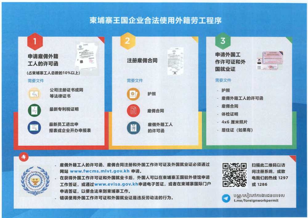 2.务必确保在柬就业程序合规合法。确认用工企业拥有柬埔寨劳工和职业培训部颁发的雇用外籍工人的许可函,并自行或通过用工企业向柬埔寨劳工部门申请外国工作许可证和就业证,可登录柬埔寨劳工和职业培训部网站查询、申请(网址:www.fwcms.mlvt.gov.kh,该网站有柬文、英文版,可使用翻译软件辅助查看)。收到外国工作许可证和就业证后,需在柬埔寨驻外使领馆申请工作签证,也可登录www.evisa.gov.kh网站申请电子签证,或在柬埔寨各国际口岸申请落地签证。请注意,持旅游签证或其他非工作签证的外国人不得在柬埔寨就业工作。
