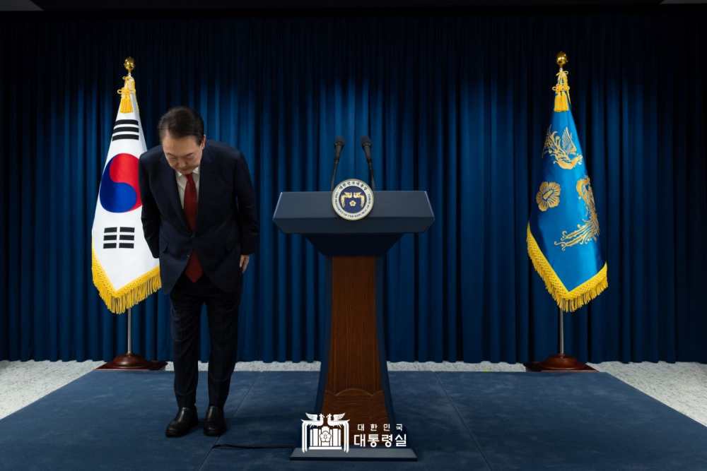 2024年12月7日,韩国总统尹锡悦表“对国民谈话”,就日前发生的紧急戒严事态致歉。图片来源:韩国总统府官网
