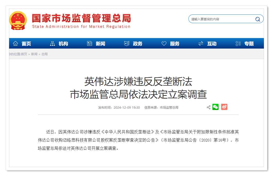 中国国家市场监管总局称,近日,因英伟达公司涉嫌违反《中华人民共和国反垄断法》及《市场监管总局关于附加限制性条件批准英伟达公司收购迈络思科技有限公司股权案反垄断审查决定的公告》(市场监管总局公告﹝2020﹞第16号),市场监管总局依法对英伟达公司开展立案调查。