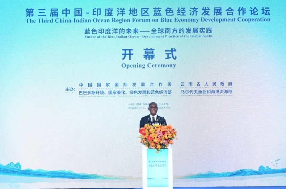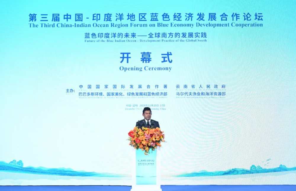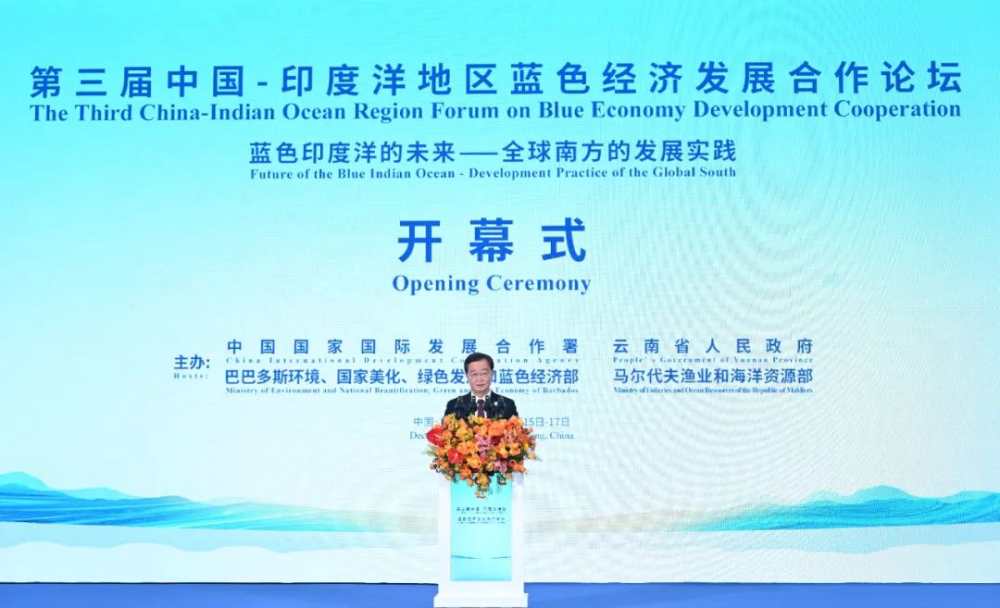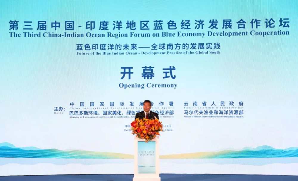 巴巴多斯参议长法利、马尔代夫副总统拉提夫代表共同主办方致辞,高度评价本届论坛重要意义,感谢国合署、云南省连续三年举办论坛,表示巴、马兼具海洋大国、小岛屿发展中国家特点,高度重视蓝色经济、海洋可持续发展,愿与各方加强政策协同和务实合作,推动以“蓝色”为核心的共同发展,将印度洋地区打造成和平、进步、可持续发展的蓝色摇篮。