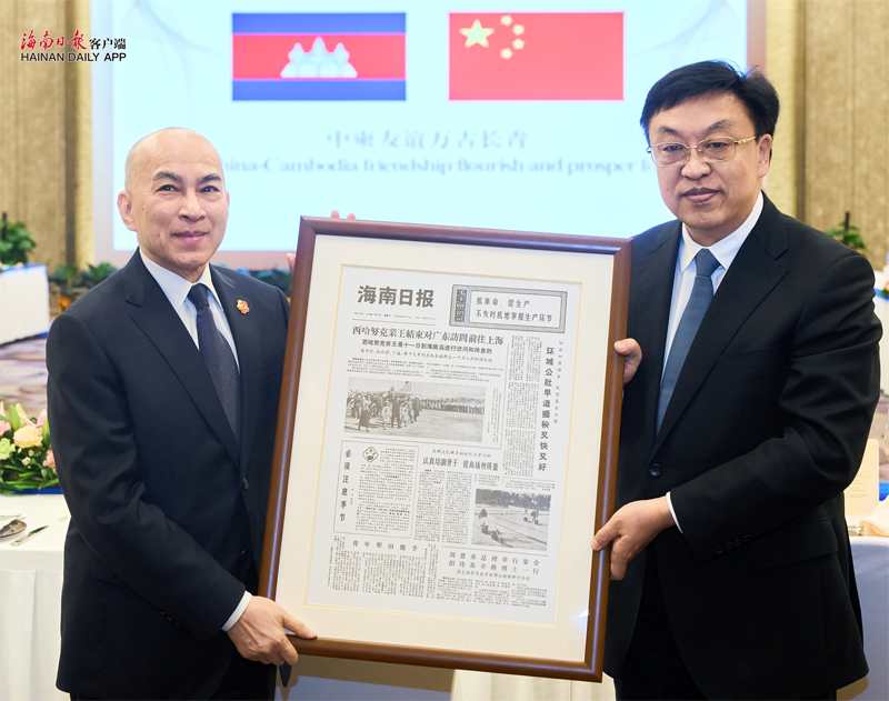 西哈莫尼对海南方面的盛情接待和周到安排表示感谢,赞赏海南自由贸易港建设取得的成绩。他说,柬中两国友好交往源远流长,传统友谊历久弥新,这份友谊是两国老一辈领导人共同建立的,一直延续到今天。希望以此次访问为契机,进一步深化柬埔寨与海南的交流合作,加强互学互鉴,密切人员往来,推动中柬全面战略合作伙伴关系持续深入发展,更加巩固柬中两国悠久的兄弟般的铁杆友谊,以更加务实的合作成果更好造福两国人民。