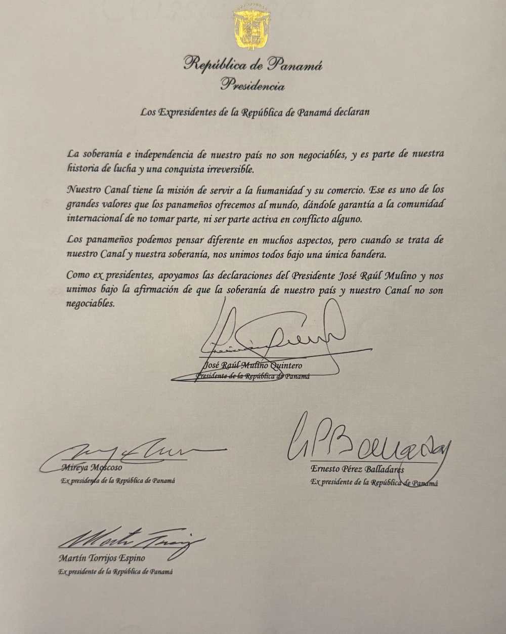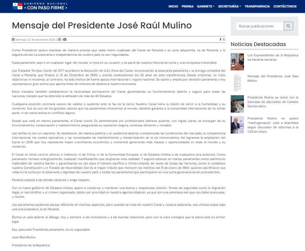 12月23日,巴拿马总统穆利诺会见该国四名前总统。四名前总统联合声明表示,支持总统关于巴拿马运河的声明,他们表示巴拿马的“主权和独立是不可谈判的”。四位前总统联合声明说,巴拿马运河的使命是服务于人类及其商业。这是巴拿马人向世界提供的伟大价值观之一。声明指出,巴拿马人可能在许多方面有不同的想法,但当涉及到我们的运河和主权时,我们都团结在一面旗帜下。