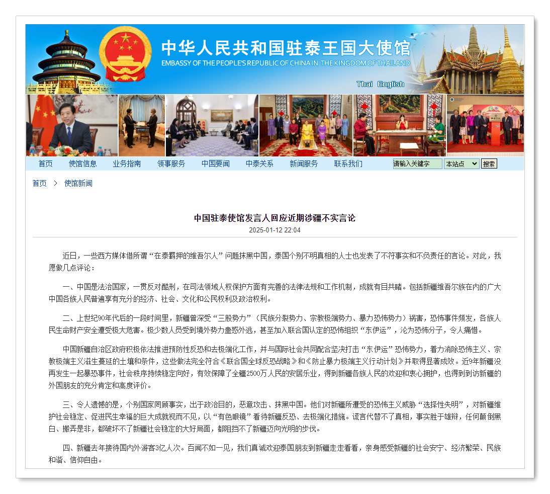 AseanAll /东盟全景讯 2025年1月12日晚间,中国驻泰国大使馆发言人回应近期涉新疆不实言论。