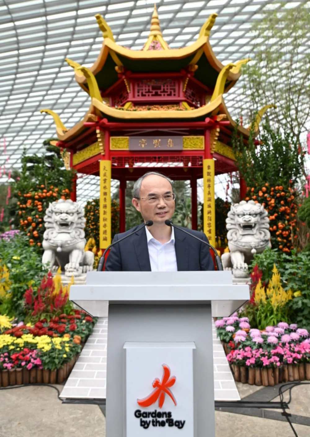 据中国驻新加坡大使馆消息,中国驻新加坡大使曹忠明与新加坡卫生部长王乙康、滨海湾花园局长罗志威、各国驻新使节及各界友好人士200余人共同出席花展开幕式。