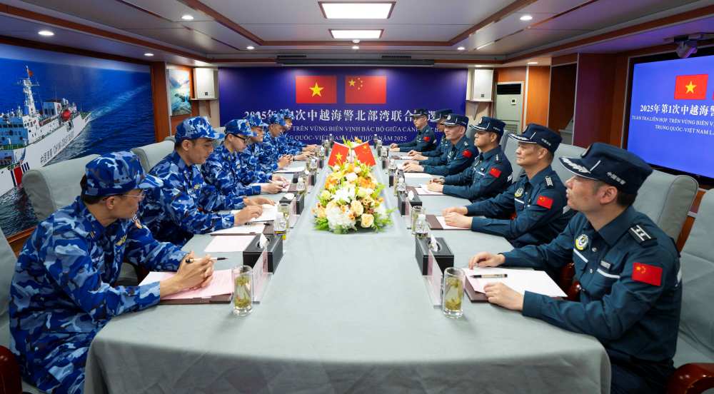 为持续深化拓展中越海警海上合作领域、增强执法合作实效,共同维护北部湾海域安全稳定及渔业生产秩序,推动中越两国海警友好交流合作,4月22日至24日,中国海警永兴舰、西沙舰与越南海警8004、8003船开展了2025年第一次北部湾海域联合巡逻。