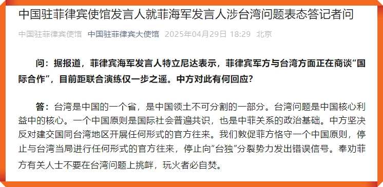 AseanAll /东盟全景讯 中国驻菲律宾大使馆微信公众号消息,2025年4月29日,中国驻菲律宾使馆发言人就菲海军发言人涉台湾问题表态答记者问。