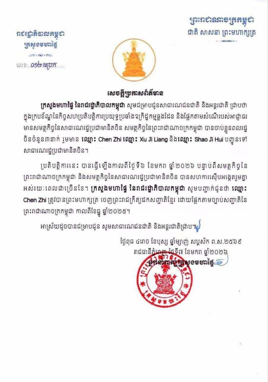 柬埔寨内政部还澄清说,根据《柬埔寨王国国籍法》,陈志的柬埔寨国籍已于2025年12月由柬埔寨国王颁布的一项皇家法令予以撤销。