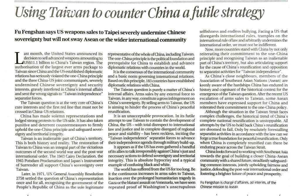 AseanAll /东盟全景讯 中国驻东盟使团消息,2026年1月13日,中国驻东盟使团临时代办傅峰山在《南华早报》发表题为《美国加大对台军售意欲何为?!》的英文署名文章。
