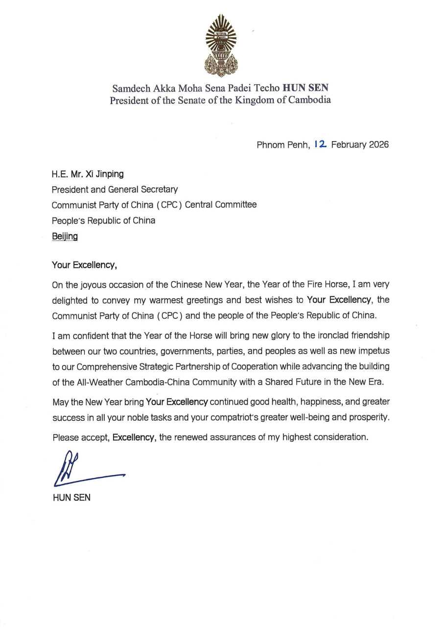 AseanAll /东盟全景讯 在2026中国农历马年春节到来之际,2026年2月12日,柬埔寨人民党主席、参议院主席洪森致信中共中央总书记、中国国家主席习近平,向习近平、中国共产党和中国人民致以最热烈的问候和最美好的祝愿。
