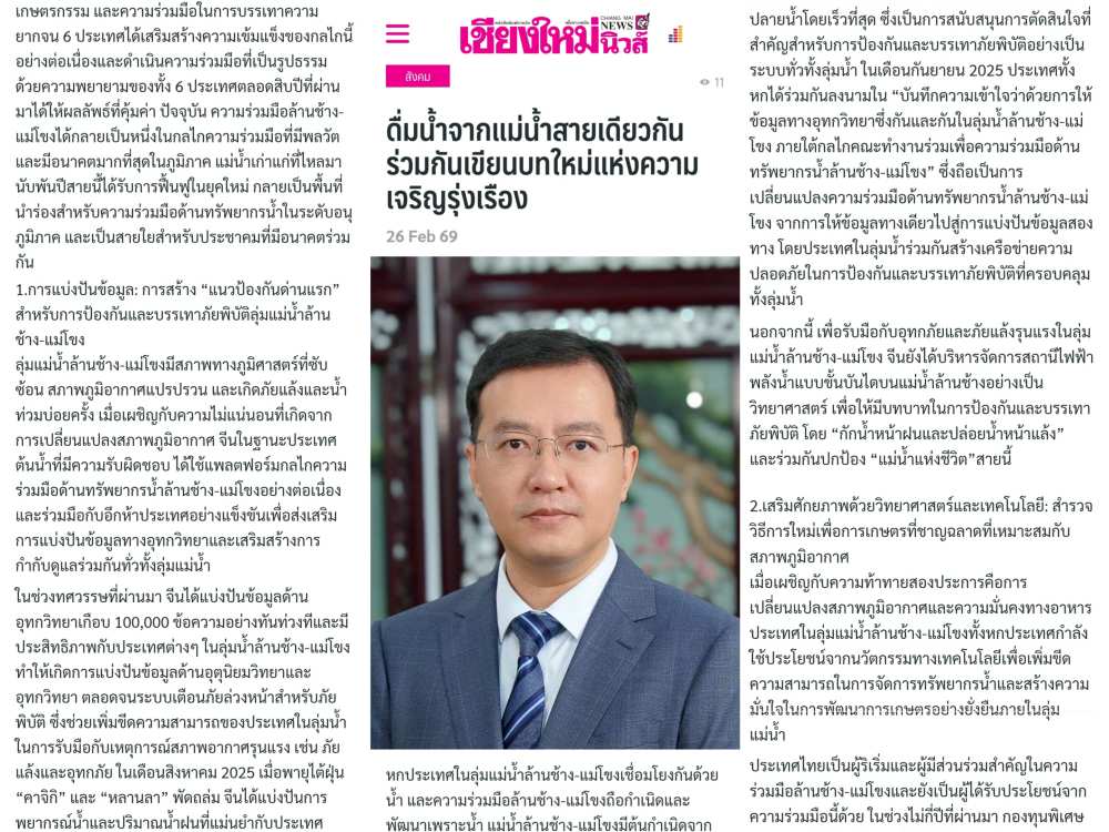 AseanAll /东盟全景讯 中国驻清迈总领事馆消息,2026年2月26日,中国驻清迈总领事陈海平在泰北主要报纸《泰国新闻》和清迈新闻、清迈消息、清迈在线、泰北角、广播电台等多家媒体网站发表署名文章《同饮一江水,共谱繁荣篇:澜湄水资源合作成果喜人、未来可期》。