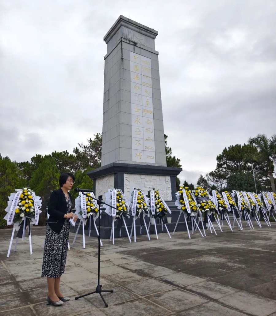 方虹致辞向中国革命先烈表达崇高敬意和无尽哀思,表示中国烈士的伟大牺牲铸就中老友谊的不朽丰碑,我们将继承英烈遗志,以建交65周年暨“中老友好年”为契机,为构建中老命运共同体而戮力前行。