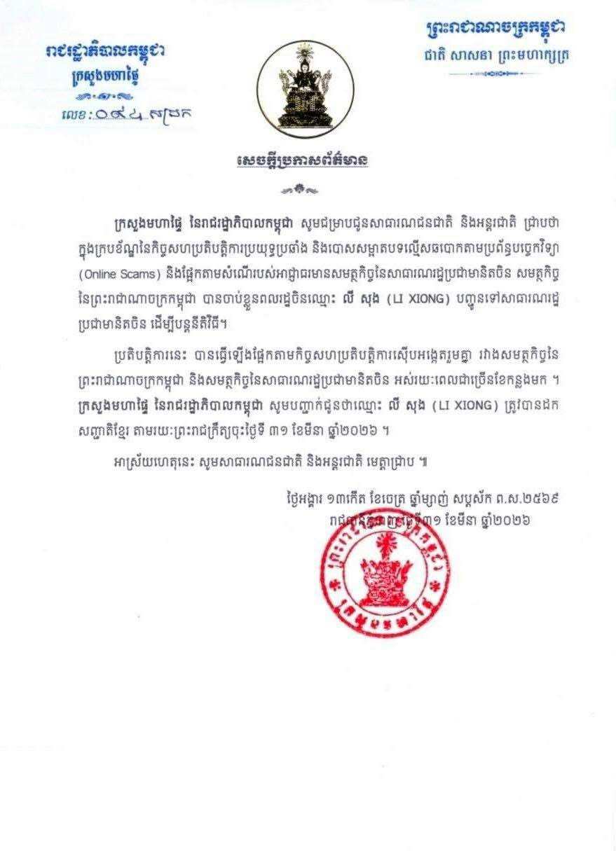 柬埔寨内政部表示,根据2026年3月31日颁布的柬埔寨王令,李雄的柬埔寨国籍已被正式撤销。