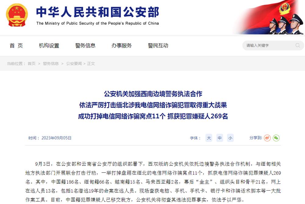 据中国公安部网站9月5日发布的消息,在中国公安部和云南省公安厅的组织部署下,云南西双版纳警方9月3日依托边境警务执法合作机制,与缅甸相关地方执法部门开展联合打击行动,一举打掉盘踞在缅北11个电信网络诈骗窝点,抓获269名电信网络诈骗犯罪嫌疑人。