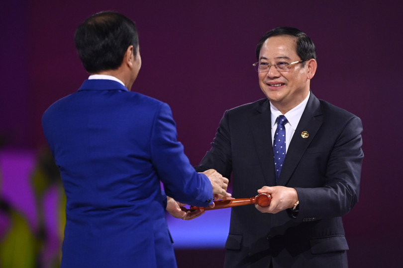 印度尼西亚总统佐科(左)在2023年9月于雅加达举行的第43届东盟峰会闭幕式上,把象征东盟轮值主席国职务的锤子交给老挝总理宋赛西潘敦。