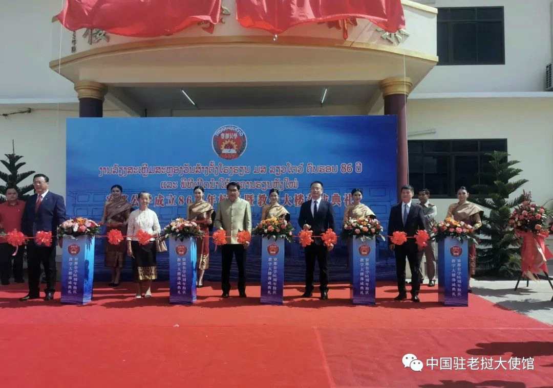 AseanAll /东盟全景讯 中国驻老挝大使馆消息,2023年11月11日,老挝万象寮都公学举行86周年校庆暨新教学大楼落成典礼,中国大使馆临时代办王畅与万象市市长阿萨潘通等共同为新教学大楼剪彩。