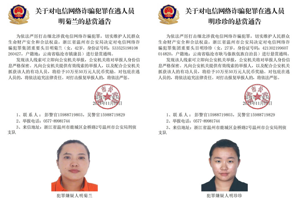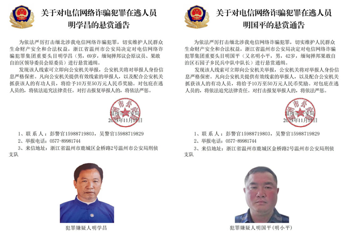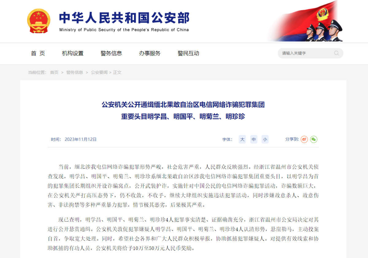中国公安部官网2023年11月12日发布消息称,中国公安机关公开通缉缅北果敢自治区电信网络诈骗犯罪集团重要头目明学昌、明国平、明菊兰、明珍珍。