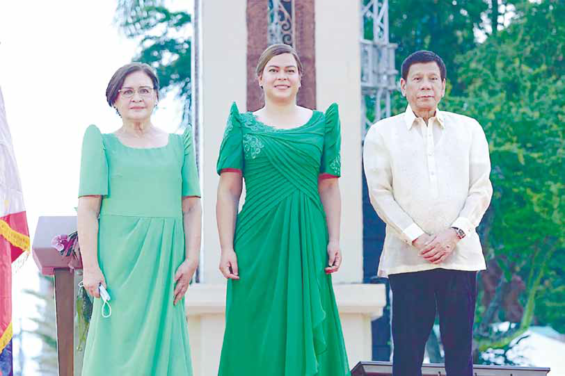 资料图:2022年6月19日,菲律宾前总统杜特尔特(右)、其夫人伊莉萨白•杜特尔特(左)和他们的女儿、菲律宾副总统莎拉(中)在达沃市合影。