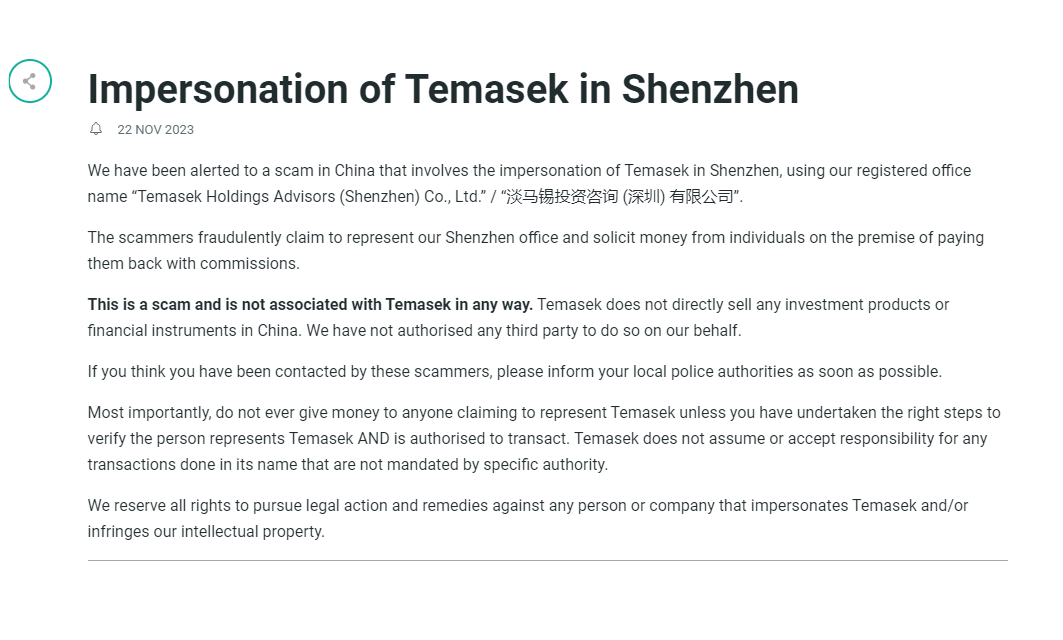 淡马锡控股2023年11月22日在其官方网站通报,有不法分子冒用淡马锡深圳分支机构“淡马锡投资咨询(深圳)有限公司”的名义在中国进行诈骗,向个人招揽钱财并声称将支付返利。