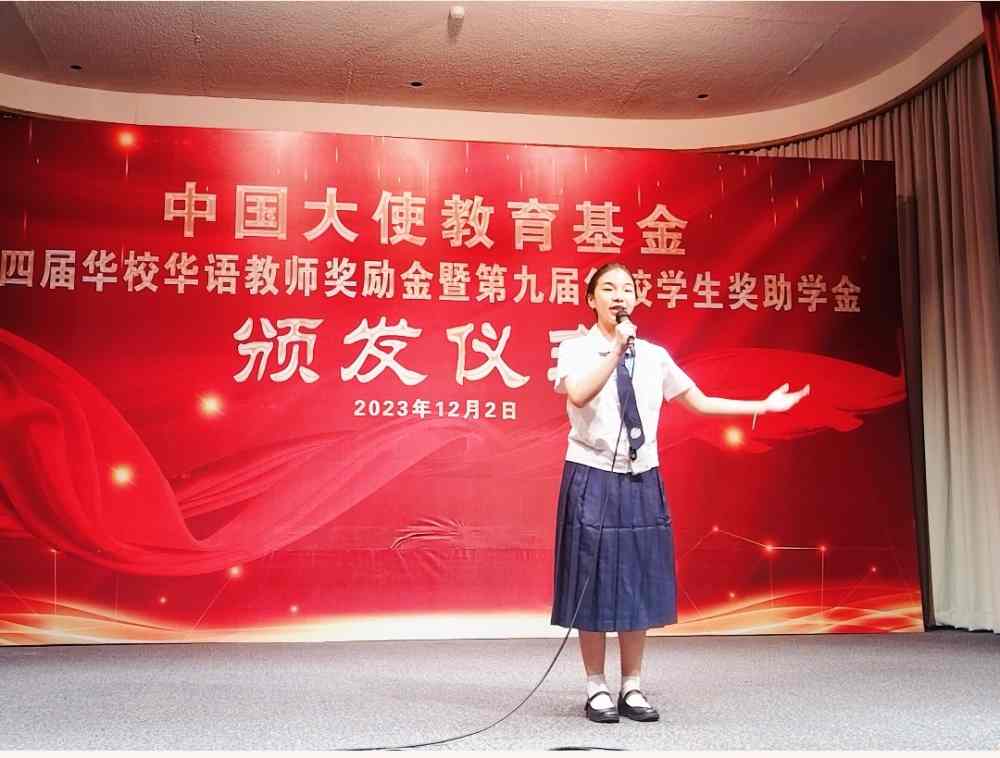 菲律宾中正学院许如西老师和嘉南中学黄荣光、中西学院施芷琳两位同学分别发表获奖感言,感谢中国使馆长期以来对华校师生的关心关爱,表示会继续教好学好华文,将所学的知识运用到服务社会和国家发展中去,同时继承和发扬中华民族优秀传统文化,为中菲友好事业添砖加瓦。