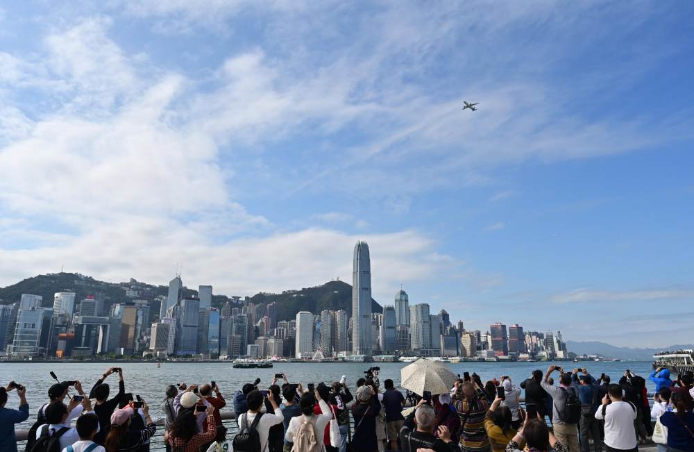 是次飞行演示吸引不少市民和旅客驻足维多利亚港两旁观赏,在遐迩闻名的香港天际线的映衬下,大家共同见证中国国产大飞机C919首次于维多利亚港上空翱翔的历史时刻。