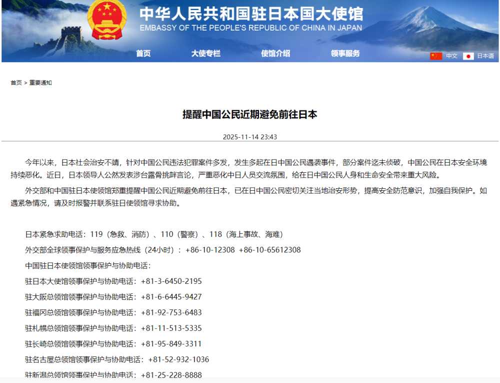 通知称,今年以来,日本社会治安不靖,针对中国公民违法犯罪案件多发,发生多起在日中国公民遇袭事件,部分案件迄未侦破,中国公民在日本安全环境持续恶化。近日,日本领导人公然发表涉台露骨挑衅言论,严重恶化中日人员交流氛围,给在日中国公民人身和生命安全带来重大风险。